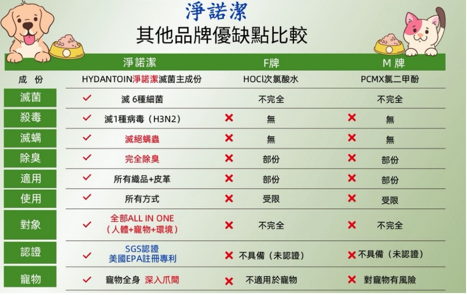 針對上述寵物家庭的痛點,「淨諾潔(Ginojez)寵物織品清潔護理液」提出了不同於傳統清潔消毒劑的解決方案。傳統酒精具有易燃性且揮發快,僅能達成一次性殺菌效果,還可能刺激毛孩敏銳的嗅覺與皮膚;淨諾潔則採用美國專利抗菌因子(DMDMH),其核心優勢在於「長效抑菌防護」。